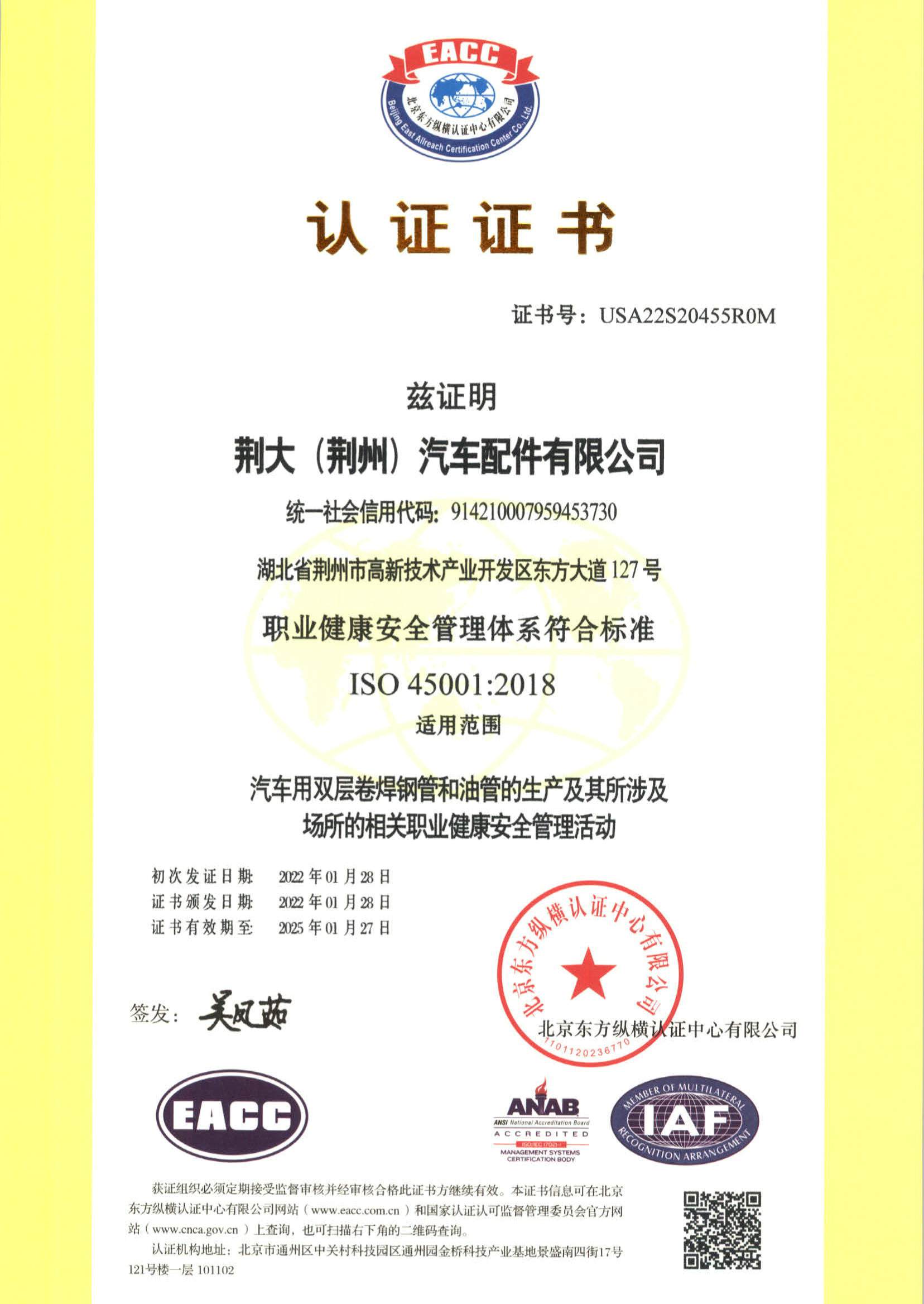 職業(yè)健康安全管理體制證書